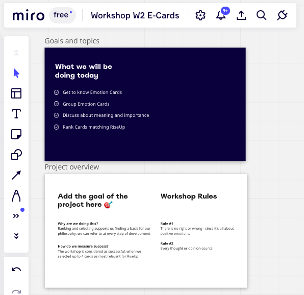 This project starts with an „Empathise“-Workshop to gather all information available and dive deep into understanding and talking about the background and motivation of Rise Up. The team works with emotion cards and groups them in various order of tasks. Aim is to end up with three to four cards representing most of Rise Up.